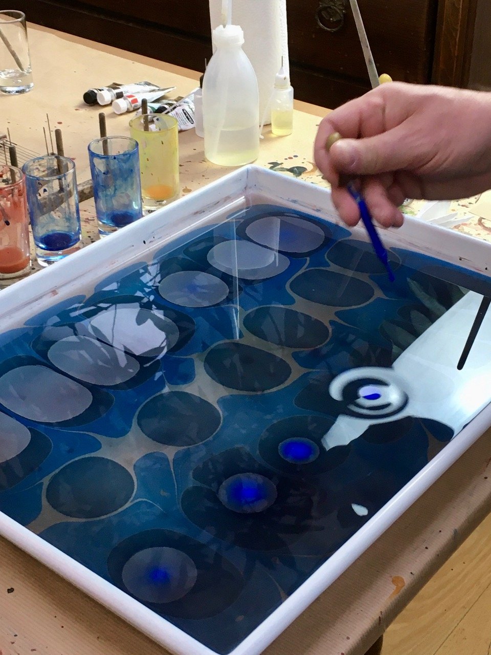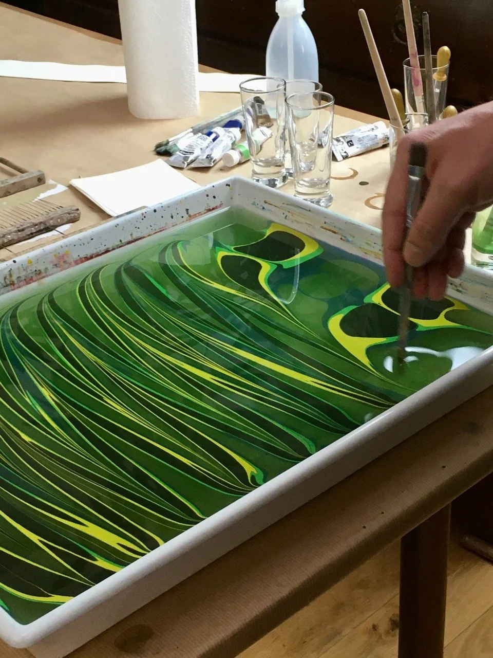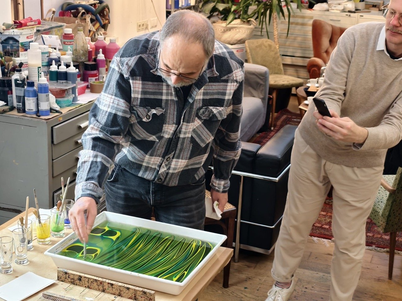 Im Rahmen des Workshops werden diese Techniken vorgestellt, Schritt für Schritt vermittelt und gemeinsam praktisch erprobt. Die Teilnehmerinnen und Teilnehmer erhalten Einblicke in Materialien, Werkzeuge und Arbeitsweisen der klassischen Marmorpapierherstellung und können eigene Papiere gestalten.
